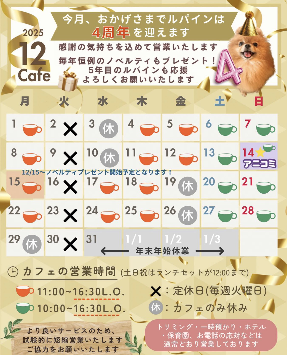 ・トリミング待ちの際、30分以上お席を使用する場合はカフェのご利用をお願いいたします。